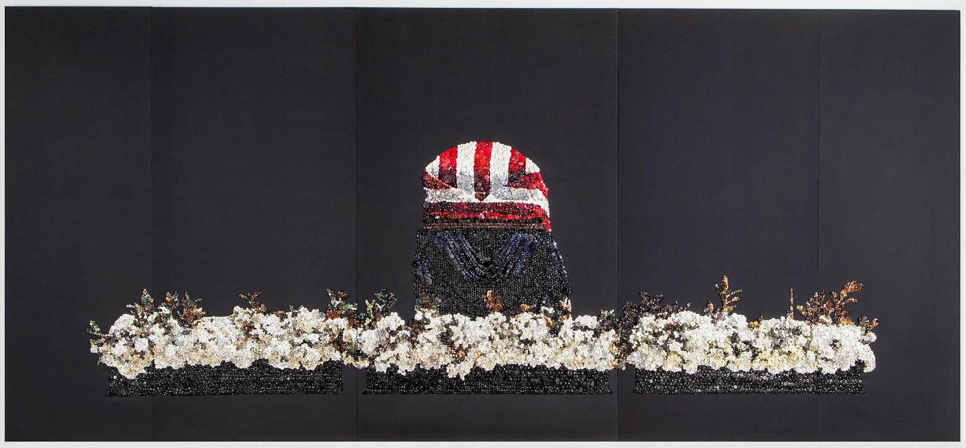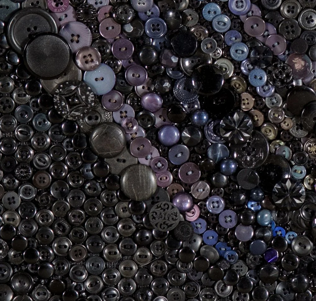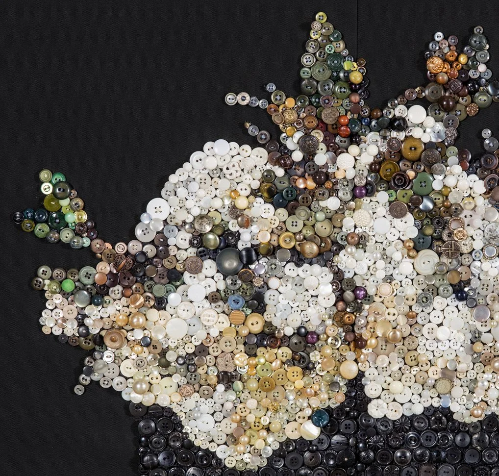 In the weeks following Justice Ruth Bader Ginsburg’s death, the image of her casket flanked by planters of white roses became embedded in my mind. It was as if by retracing each detail I was trying to hold on to a moment that had already passed. Over the following eight months, I made Justice In Repose (RBG) as a way to process the loss of Justice Ginsburg and to honor the legacy of her service to our nation. I see buttons as materials that lend themselves to conversations about community, heirloom and women’s contributions to the fabric of American history. My hope is this piece provides an opportunity for reflection on the gifts of Justice Ginsburg’s intelligence and bravery. For those who see it in a shared space, I hope it helps in processing personal loss, leaving them empowered to continue on our march towards full equality and justice.