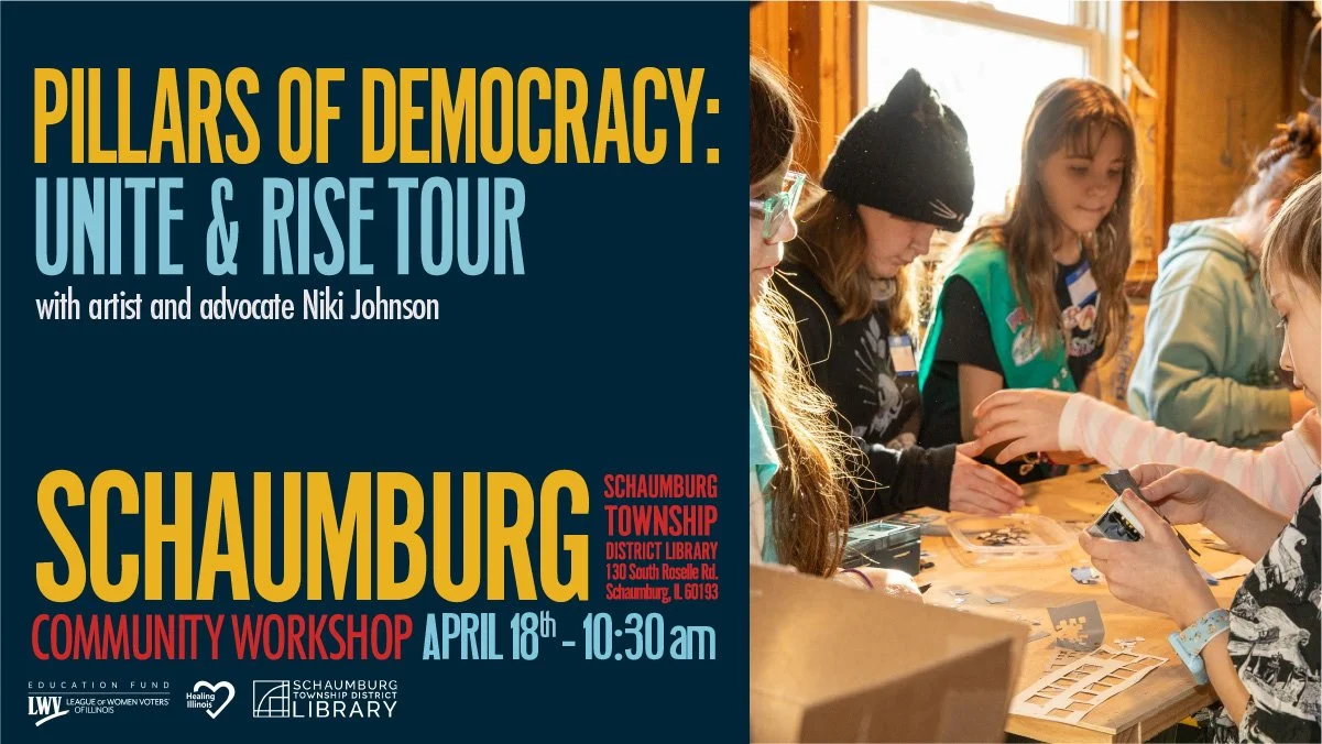 Designed for teens and adults, this interactive workshop at the Schaumburg Township District Library invites participants to explore identity, voice, and civic engagement through art-making and conversation. Led by artist Niki Johnson, teens create expressive artwork while reflecting on what democracy means to them and their role in shaping the future.